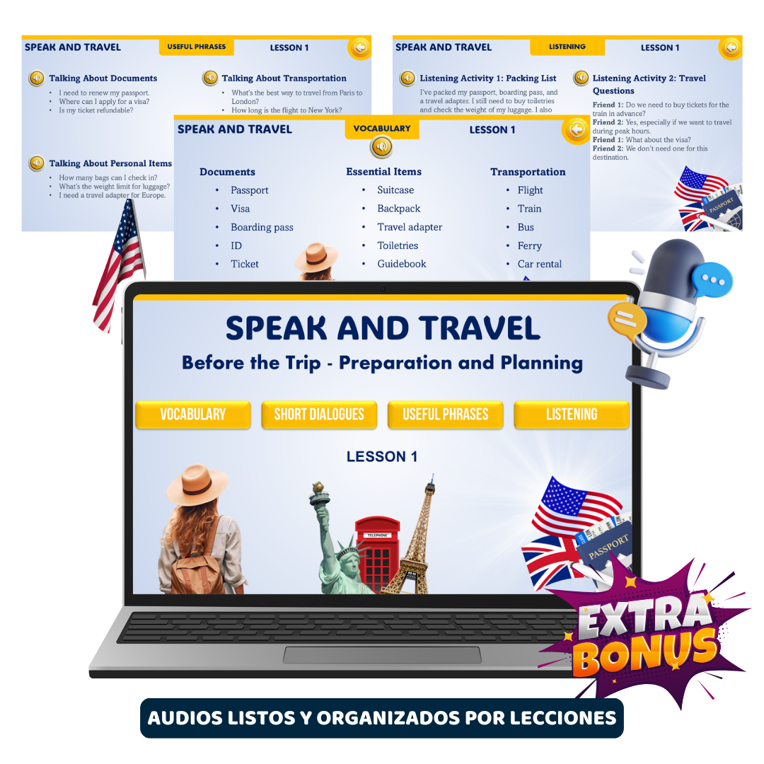 Al adquirir SPEAK AND TRAVEL, también recibes plantillas interactivas en PowerPoint con audios listos para usar en tus clases. Estas plantillas harán tus lecciones más dinámicas y te ayudarán a ahorrar aún más tiempo.