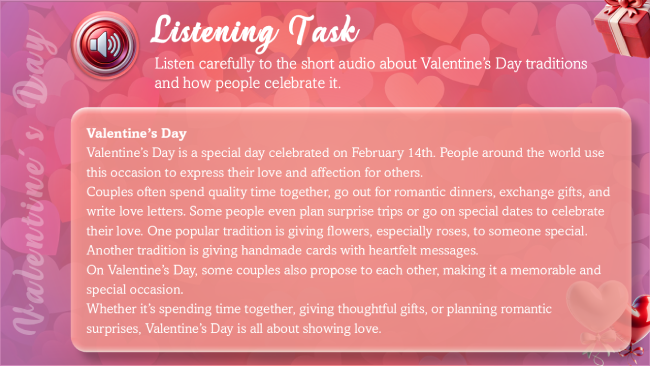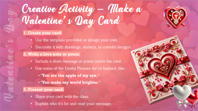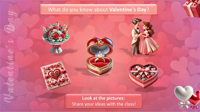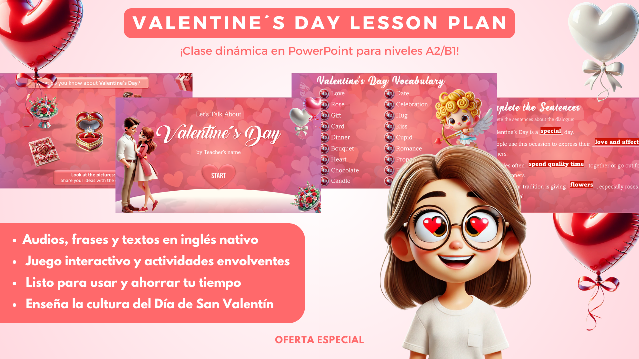 Tus alumnos practicarán inglés de forma natural, aprenderán expresiones, se sumergirán en la historia del Valentine’s Day y desarrollarán sus habilidades de listening y speaking, todo mientras se divierten.