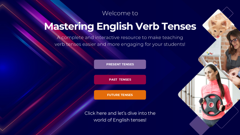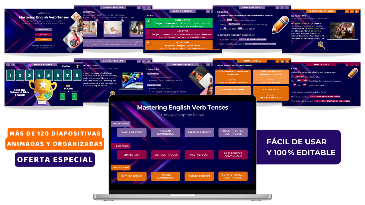 Con él, finalmente podrá presentar los tiempos verbales sin necesidad de dibujar 50 líneas de tiempo en la pizarra o dar ejemplos que solo usted entiende. Sus estudiantes podrán visualizar, interactuar y, lo más importante, aprender sin sufrimiento.